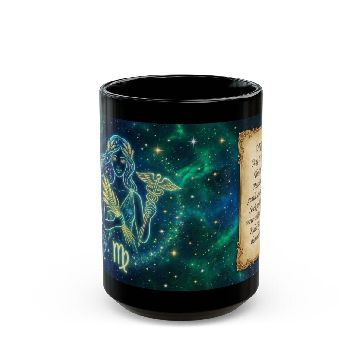 Sip slowly and let the stars settle in. This glossy black ceramic mug carries a watercolor constellation backdrop and a gentle Virgo maiden illustration, paired with a vintage parchment panel describing Virgo traits. It feels like a quiet morning ritual—warm cup in hand, reading words that nod to your thoughtful, practical side. The deep black finish makes colors pop while keeping the overall look rich and slightly mysterious. Whether kept on your desk or beside your favorite reading chair, it creates a small, personal moment that honors curiosity and calm.